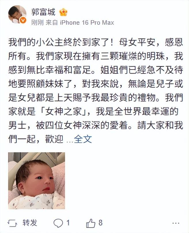郭富城发文表示“我们的小公主终于到家了!母女平安,感恩所有。”